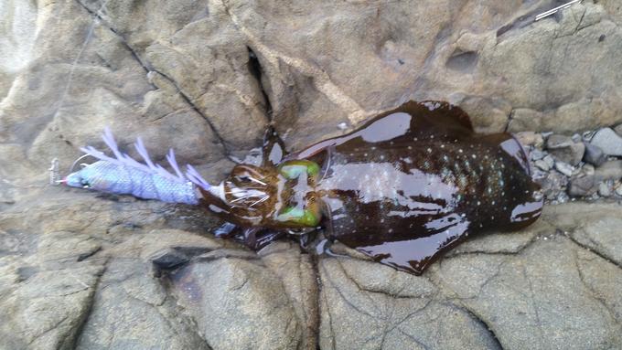 兵庫県は淡路島でエギングしてきました。サーフがらみの磯にエントリー。沖のブレイクを中心に攻めて、トンカツサイズのアオリイカGET♪同じパターンで、もう一杯アオリを追加。その後、場所移動し、一杯追加し納竿した。