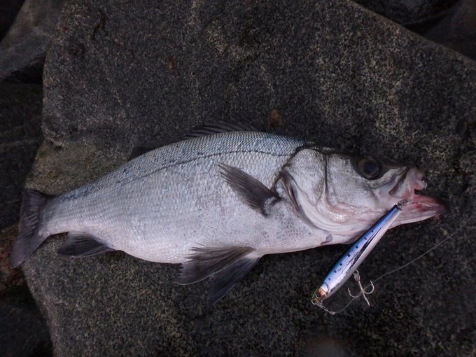 糸島半島へヒラスズキ狙いに行って来ました。当日の気象予報は西北西の風、波高2m予報。2日前から寒の戻りもあり、弱いながらもゴロタ一帯はサラシが広がっていました。前日23日の釣行から若ヒラの接岸を確認していただけに、この日も開始直後からバイトが続きます!早朝5時半が最干潮だったので、シャローエリアはやや水深不足に底荒れ気味。超遠投でブレイクより沖のラインからバイトが集中。飛距離がヒット率を大きく左右する展開で、2人で若ヒラ10バイト超の高活性でした。