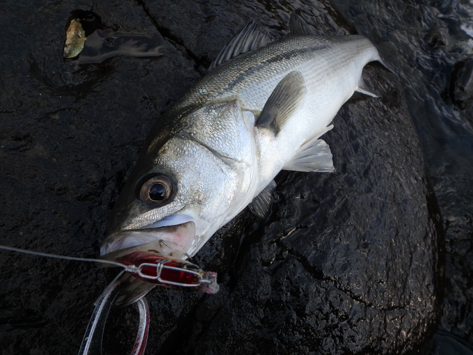 この日は西風が強く、波高3mのシケ予報。当初は沖磯へのヒラスズキ釣行を予定していましたが、検討の末中止に、、、。と言う訳で以前から気になっていた佐賀県北部の地磯へ、シーバス調査に行って来ました。実際の現地はイメージしていたより遠浅で、密な海藻類がショアラインで表層のルアーに絡んできます。しかしブレイクから沖は砂底らしく、フルキャストした着水点から20~30mのエリアはアピールできています。そして「ヘビーショット105」をフルキャストでランガンすること2時間、ようやくヒットしたのはフッコクラスのシーバス。ベイトっ気は乏しく釣果は今一つでしたが、春らしい陽気が続いた頃に再調査したいと思います。