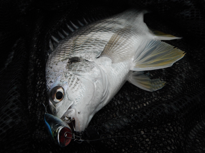 佐賀県の河川へチヌのトップゲームへ行ってきました。当地におけるこの日の満潮時刻は午前9時過ぎ頃。活発な上潮で潮位変動も早い中、狙うポイントを水深0.6~1mのエリアを目安に、少し海よりエリアからチェックすることに。「シルバードッグ60」を小刻みなアクションで、水面で「カポッカポッ!」っと誘うと直ぐに反応が出ました。ルアーの背後から「モァ~」っと海面を揺らし「ジュポッ!」っと鋭くバイトしたのは40cm弱のキビレです。この日は朝の間1時間半の短時間でしたが、キビレ4バイトと高活性な個体が多く楽しめました。