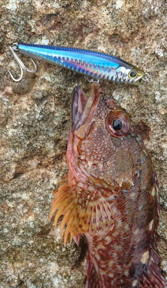 ロックフィッシュゲームで魚が低活性の状態で使用、ボトム着低からワンピッチジャークでシャクリ上げ、フォールに入った瞬間にヒット。