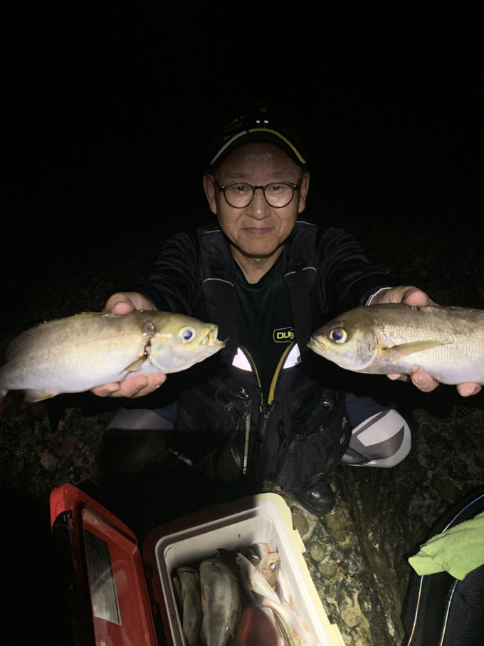 20年ぶりに和歌山椿温泉にイサギの夜釣りに十数年ぶりに行ってきました。 出船前2時間は物凄い豪雨で出船も危ぶまれましたが、18時にぱったり止み出船できました。 上がった磯は、黒島という磯です。 周りが少し薄暗くなってくると、磯際を流していたウキが威勢よく入ってきます。 それから、2時間半ほぼ入れ食いで納竿いたしました。 本日の釣果は35~25センチを50匹でした。 9月いっぱいは楽しめるでしょうね。