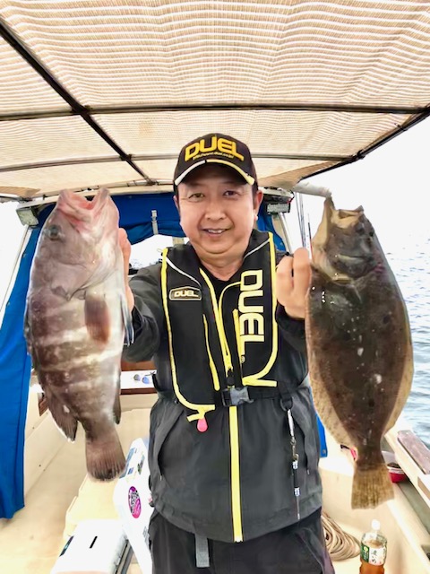 釣友大島さんの船でキス釣りに出港。小型のキスを一通り釣った後は、そのキスをエサに泳がせ釣りで大物狙い。ポイントを沖に移して大島さんがネリゴ(カンパチ)、マゴチ、ヒラメ、私がタカバ(マハタ)、ヒラメと釣り、美味しい土産に満足な釣行でした。