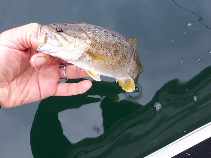9月に入り、野尻湖は例年通りタフになってきました。減水やわずかな濁りが原因でしょう。しかし、小バスは数釣り楽しめます。魚探でベイトより明らかに大きい個体がフラット5~7mに映ったら、ライトリグを落とせば