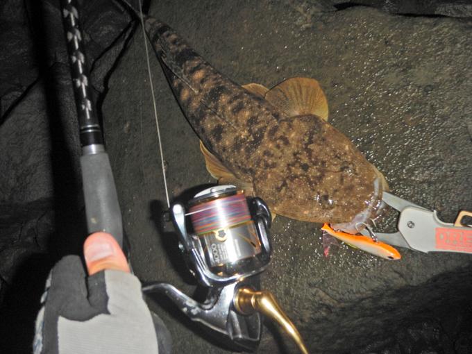 岩場と砂地のポイントでリスクはありますがボトムレンジをHARDCOREフィンテールバイブ70のショートジャークしながらレンジキープさせるイメージで扱い、ナイスサイズのマゴチをキャッチしました。すっかりエース級の活躍です! ランディング時に目の前の石積みのブレイクでSUPER X-wire X-8 1.5号を岩で擦られてしまいましたが、ラインブレイクすることなくランディングまで行くことができました!