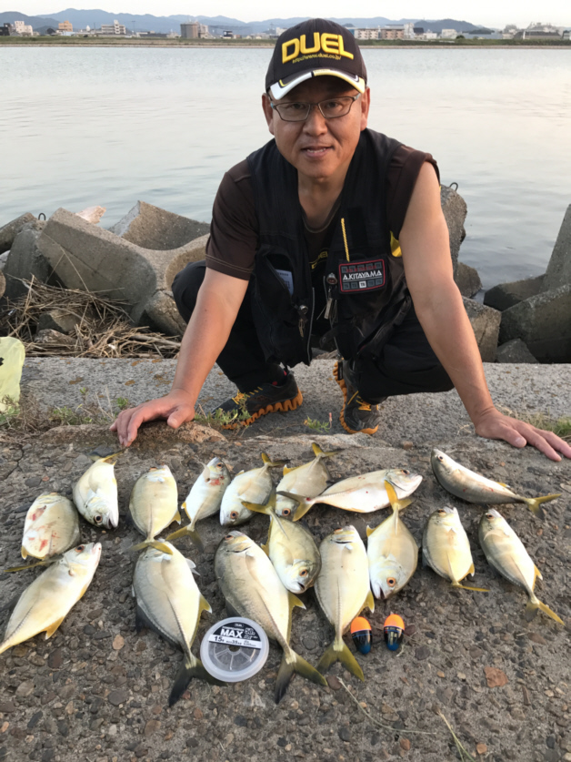 久々にやっとこさ天気になりましたので、今シーズン初の紀ノ川リバーGTフィッシングに夕まずめの時合を狙って紀ノ川右岸の土入川河口にいってきました。本日の潮は中潮の初日ということで13時ごろが干潮なので川の流れが上流の方に流れる上げ潮を狙っての釣行となりました。満潮が19時ごろなので現着は15時。やはり思ってた通り、上げ潮が効いていて流れは上流に向かってトロッ~と流れていい感じです。出足は、キビレチヌのベイビーチャンに遊ばれましたが、流れが上流に流れ出すとイッキに食いが立ち、1時間半の間に16匹ゲットすることが出来ました。リバーGTも後半にさしかかってきているのでサイズも良く、1号のハリスをぶち切って行くのも数匹ありました。おそらく30オーバーだと思います。今年は水温が高いのでもうしばらくはやれるでしょうね。