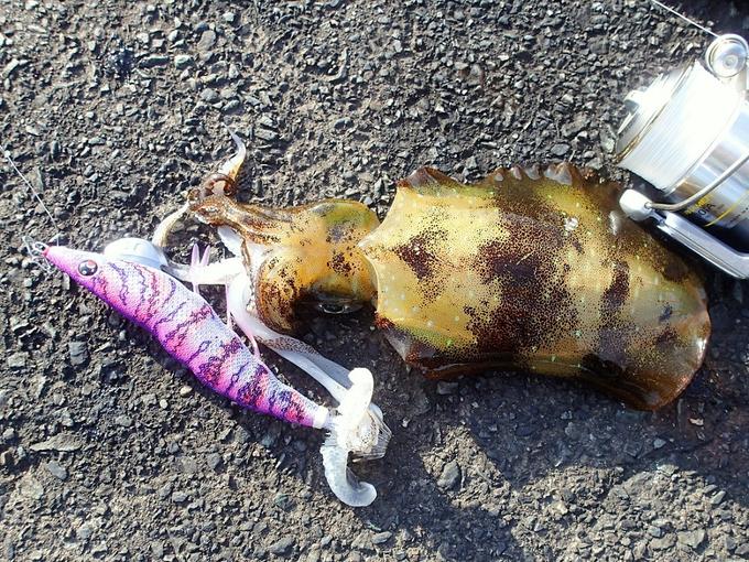 ポイントに着いたら爆風でラインが浮き上がる。そこでラインコントロールに注力し慎重にエギを海底に運ぶ!そのひとシャクリ目、狙いどおりにアオリイカがヒットしてくれました。