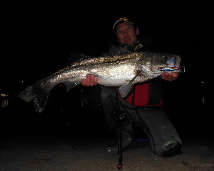 山陰シーバスもラストスパート。12月は1年で最もランカーシーバスを手にしやすい時期です。と言う事で私も一発ランカー狙い!!夕マズメの下げ潮が緩い状態からエントリー。まずはハードコア® シャローランナー H2 120mm をアップ気味に流すと1時間程で70クラスを2本キャッチ。その後潮が速くなりハードコア® シャローランナー H2 120mm では少し暴れ過ぎるので、少し細身で速い流れの中よりナチュラルに攻める事が出来るハードコア® シャローランナー H3 120mm HBPCにチェンジ。ダウンキャストで流して行くと流れが若干変化した所でバイト!!狙い通りハードコア® シャローランナー H3 120mm HBPCで産卵前のでっぷり太ったランカーシーバスをゲットする事が出来ました。