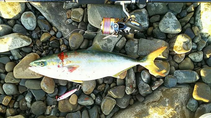 シーズン真っ直中のショアジギにリベンジ! 大潮で海はいい感じに流れてはいるんですが、渋いのか釣れてる様子は・・・。 オレも当然のように反応ナッシング。 そんな中、ガツッ!っとアタリが! あわせてみるもフッキングせず。 この状況で、貴重な1バイトを逃してしまいます。 するとその数投後にまたガツッ!っとアタリが。 今度はドリャー!とあわせてみるとフッキングも決まって。 ドラグを鳴らしながら、走る走る。 すぐさまドラグを調整し、獲物と格闘モードへ! 徐々に引き寄せてくると、右や左に走りまくりで青物確定モード点灯! 格闘すること・・・何分なのか判りませんがオレ自身、2年ぶりのショアジギで青物確保。 ラインを信じて、多少強引にやり取りもしましたが、丸々とした43cmのハマチでした!