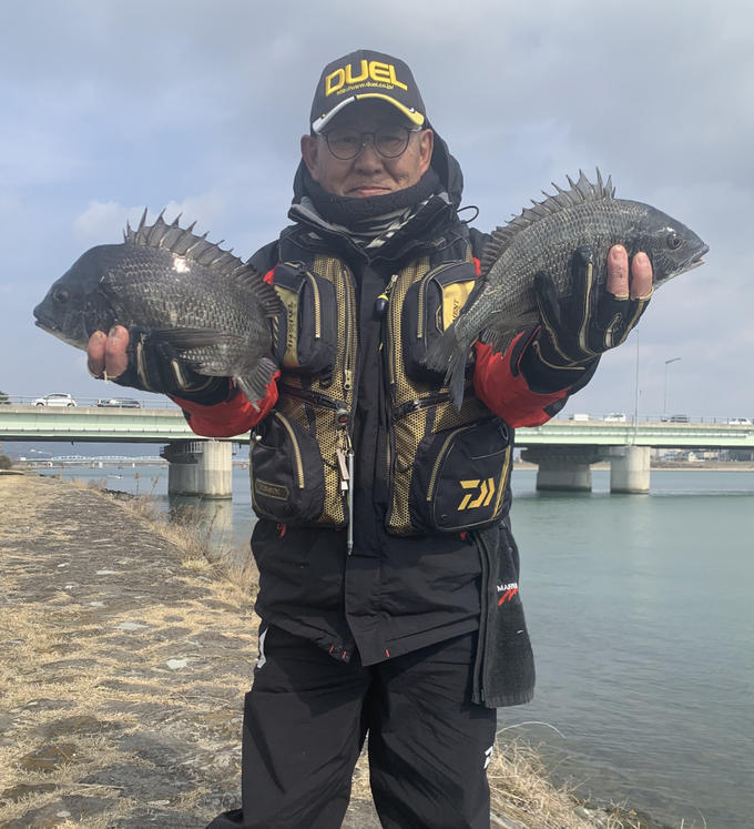 本日も 紀の川 チヌ調査に行って来ました。ポイントは、紀の川大橋下流。紀の川では 最悪の北東風と下り潮。風と流れが沿って大激流で苦戦しましたが 風向きが変わった数分の間に何とか 42と35センチをゲットできました。