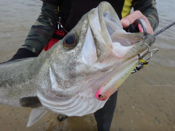 前日に続いて博多湾サーフにトップゲームへ!この日は北風が強く海面が波立っていました。向い風の中、飛距離が出し難い状況でしたが「シルバーポップ75」をなんとかヒットゾーンまでフルキャスト。沖ではポッパーのスプラッシュアクションが見え難いほどのザワザワした海面。この状況下、極力ルアーが水面で暴れ過ぎないように、ソフトにそして小刻みなポップアクションを意識して誘うこと1時間。沈黙を破るバイトは超ド派手なスプラッシュで!70cmアップのシーバスをキャッチです。その後、キビレが2バイト。ハイシーズンを目前にマズマズの手応えの釣行でした。