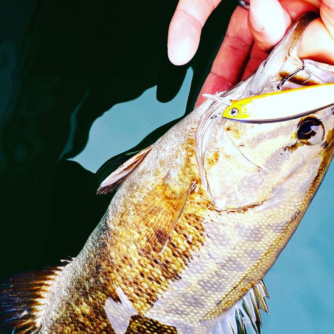 野尻湖のスモールは6~7月のアフタースポーンから夏にかけてのシーズンがトップシーズンといっていいほどよく釣れます。今回は、ミノーフラットspのトゥイッチにて好反応。3~5mラインにこの日はベイトが多く水面下にてヒットシーンが見られます。