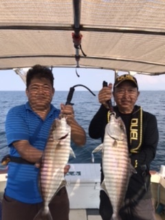 釣友大島さんのマイボートで響灘へジギング釣行へ行ってきました。参加メンバーは大島さん、野瀬さん、村上君と私の4名。最初は水深55〜60m付近を探っていたが全くアタリがないため、水深30〜35mエリアへ移動。するとネリゴ(カンパチの子)が連続ヒット。ポイントはピンポイントなので、船長が何度も船を付け直してくれ無事全員安打達成。特に村上君が良くロッドを曲げて楽しんでいました。