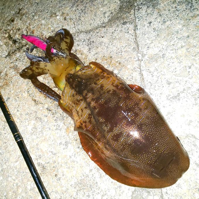 夜中暴風からの夜明けでは無風でエギング開始 早々に釣れた