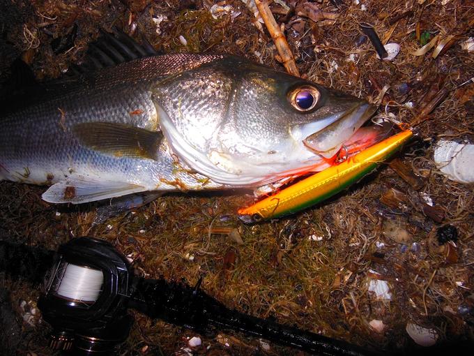 プロトロッドのテストを兼ねてシーバスゲームにいってきました。潮見表どうりに潮が流れず苦戦してましたがたまたまトウゴロウイワシの群れが通りがかりチャンス到来!!ハードコアシャローランナーH3を早巻きしトウゴロウイワシの群れの中で「ぴたっ」とストップ。止まったハードコアシャローランナーに思惑どうりシーバスがHIT!!サイズこそ60クラスでしたが今シーズン一発目のシーバスをゲットする事が出来ました。