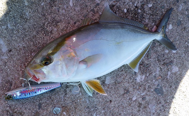 今週もモンスターショットでショアジギングです。今回はシオ狙いなのでモンスターショット80で狙います。ボトムまで落としてジグの様にしゃくっていると「どんっ!!」周りは釣れてない中モンスターショットで3連発!!もうショアジギングでジグ要らないかも(笑)