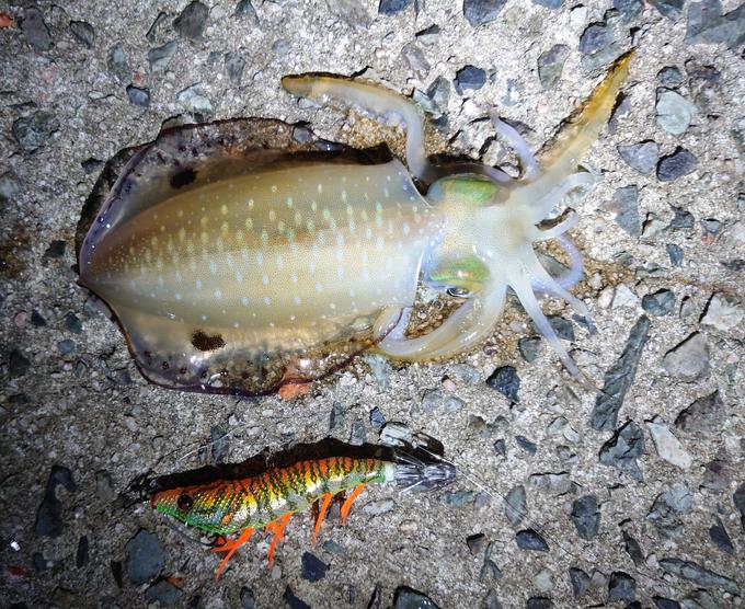 天候は晴れで風もなく潮も動いてる状態で、使用エギはEZ-QCAST喰わせの夜光ゴールドオレンジを使用しての釣果でした。