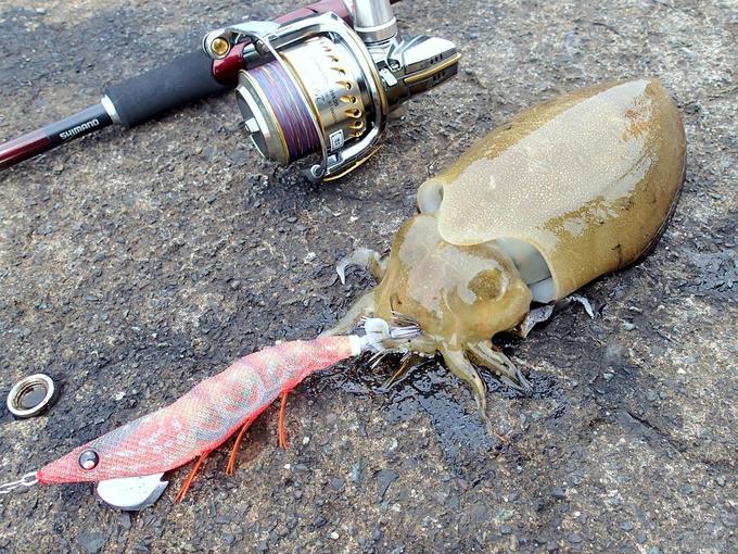 今シーズン初エギングの合間、同行の皆さんと離れ人気のない砂地のポイントで、ボトムにEZ-Q® ダートマスター™ 3.5号 LRBEをしっかり着底させスローにワンピッチで探れば、予想どおりのコウイカが明快なアタリでヒットしてくれました。
