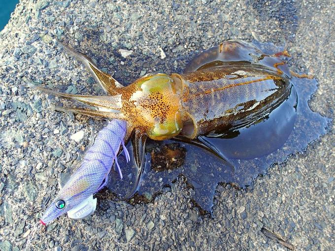 小型アオリイカをゲットした後、サイズアップを期待し実績の高いイージーQダートマスターラトル 3.5号をチョイス。カラーは迷わず実績の高いRISEからスタートすれば、その一投目からを中型がヒットしてくれました。
