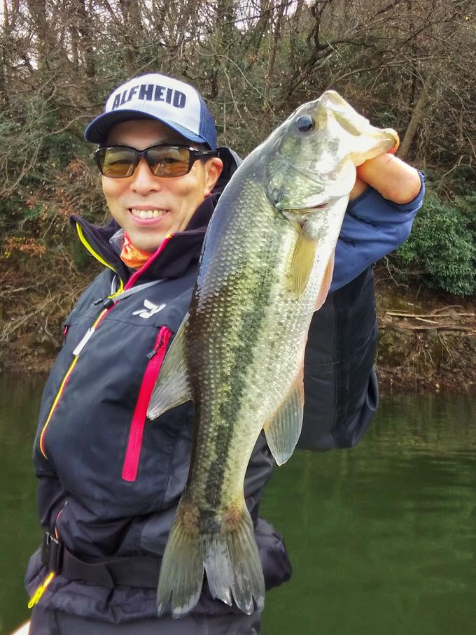 今回は津久井湖に出撃!そして…この季節の貴重なバスをメタルバイブでキャッチしてきました! この時の状況としてはブレイクに絡むベイトの群の上にバスらしき魚影を発見。 メタルバイブを投入し、ロッド1本分ぐらいリフト&フォールさせたら痛恨のミスバイト…。念のためそのまま同じ場所でリフト&フォールを繰り返してみると…再びフォール中に“ドン”って感じです。 やっぱりスローなスライドフォール効きますね。 今回、使用したラインは伸びが少なく、感度ビンビンの「Armored F+ Pro BASS」+リーダーにはステルス仕様の「ビッグ フロロカーボン」。「ビッグ フロロカーボン」は光の反射を抑え、水に馴染みやすいラインなので、水の透明度が高まるこの季節にはオススメですよ!
