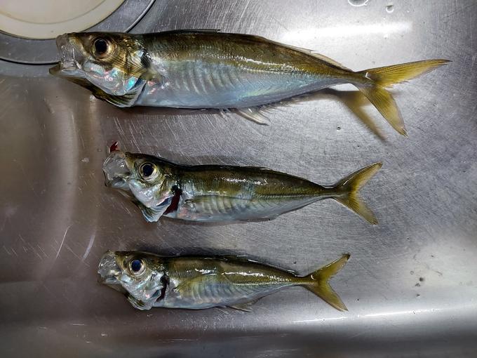 魚さばいてる途中に写メ撮り忘れているのに築き急いで取りました。 サイズはまちまちですが3時間で20匹ぐらいでしたが、カマス・サバが先にバシトしてきて以外とてこずりました。