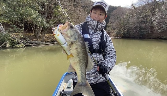 戸面原ダムへ釣行。真冬ポジションにベイトもバスも魚影は少なく、全体的に魚の動きが感じられず。中途半端に浮いている可能性は考えられましたが、強い濁りでジャークベイトはパワー不足。スピナーベイトでは止めの間が作れず。そんな時に同船者のビッグベイトに急浮上バイトで44cmが釣れ、それをヒントに廃盤となってしまったニンジャスイマーを投入!思惑通りに45cmのグッドサイズを浮上させる事に成功しました!このルアーは自分的にビッグジャークベイトとして捉えると有効的なシチュエーションがあります。廃盤となってしまいましたが、売れ残っているお店があったら購入をおすすめします!そして、この釣りを想定してなかった為、有り合わせのタックルで代用。TBカーボンBASS16Lbと、この釣りには細すぎるバランスでしたが、竿もMHクラスで柔らかめだったのと、柔軟性のあるライン特性で粘ってくれました。むしろこの時期のバイトにはこのような柔らかいタックルが効果的かも!?でもどちらにしてもラインの太さは20Lbは欲しいところですね。