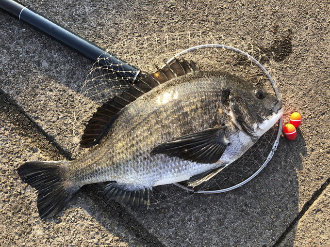 暖かい日が続き、そろそろ乗っ込みのクロダイが狙える時期となったので、神奈川県川崎市にある東扇島西公園へ行ってみました。風も弱かったのでTGポートマスターの0にG5のガン玉を打って午後1時からスタート。上げ潮が効き始めると幸先良く46センチのクロダイがヒット。その後、30センチクラスを追加し、午後4時頃にはひときわ強い引きを楽しみ、水面に浮いたのは丸々と太ったまさに乗っ込みという魚体。測ってみると54センチもある大型でした。