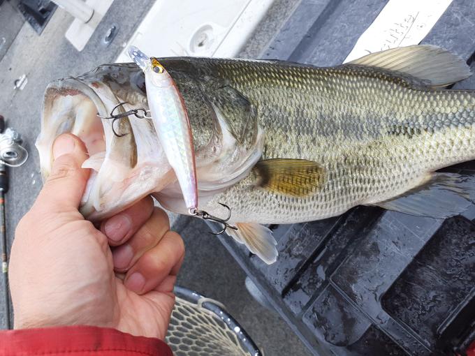 冷たい小雨が降る河口湖。水温13℃。スポニングでシャローにあがる一歩手前で2~3メールのブレイクをジャークベイトにて。ステイを2~3秒とりました。濁りがややあったのでT-バスシリーズのキラキラがよかったのでは!40アップ2本。
