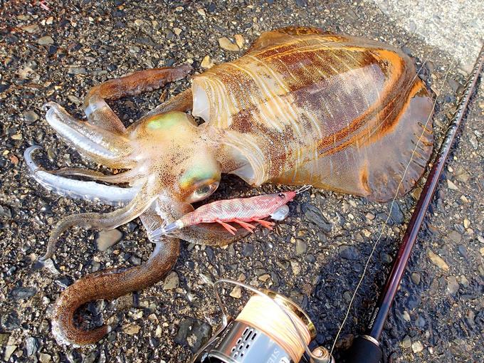 真昼間の満潮前の込み潮を狙い、お気に入りのイージーQ® ダートマスター™ 3.5号 LRBEでスローに誘う。感度抜群のアーマード® F+ プロ エギング 0.6号が微かなアタリをグリップに伝え、視認性の良いラインがスーッと走る。その瞬間改心のアワセでロッドを絞り込んだのは大満足の良型でした。