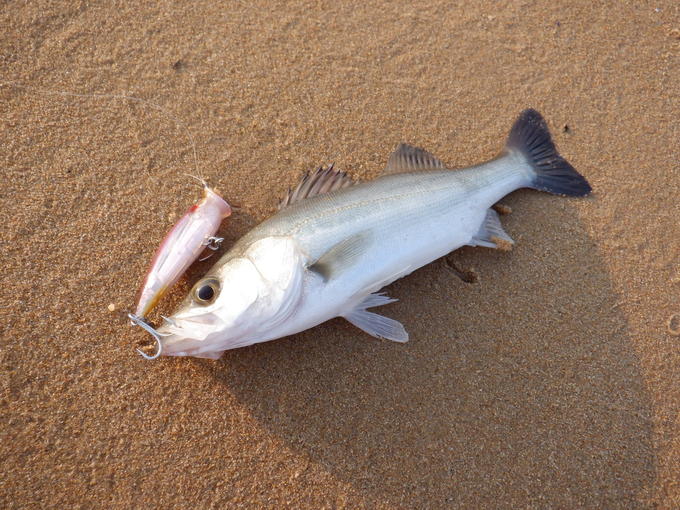 例年、初夏からシーズンインする博多湾サーフのトップゲーム! シーズンインに向けて現地の状況をチェックに行って来ました。まだ少し薄かったですが、ベイトの姿を確認できました。 Lブルーシリーズ「スピットポップ70F」をメインに使用してシーバスをキャッチです。この日はシーバスオンリーでしたが、もう少しベイトが密になってくると、キビレやクロダイもサーフのシャローへ入ってくると思われます。