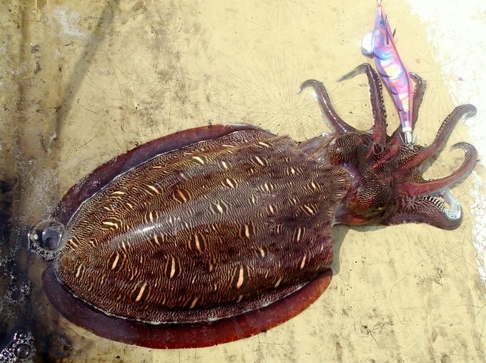 毎年梅雨入り前に実績のあるコウイカのポイントで新製品のアオリーQ3D4.0号をキャスト。マーブルのどれかがヒットカラーになると信じてダブルマーブル仕様のKVMMをチョイス。サイズの良いモンゴウイカがヒットしてくれました。