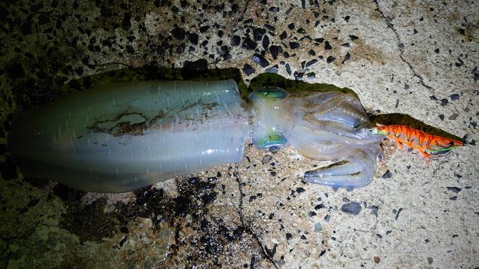 ナイトエギングでの釣果でした。今回の使用したエギは、EZ-Qキャストプラスの夜光ゴールドオレンジを使用しての釣果です。