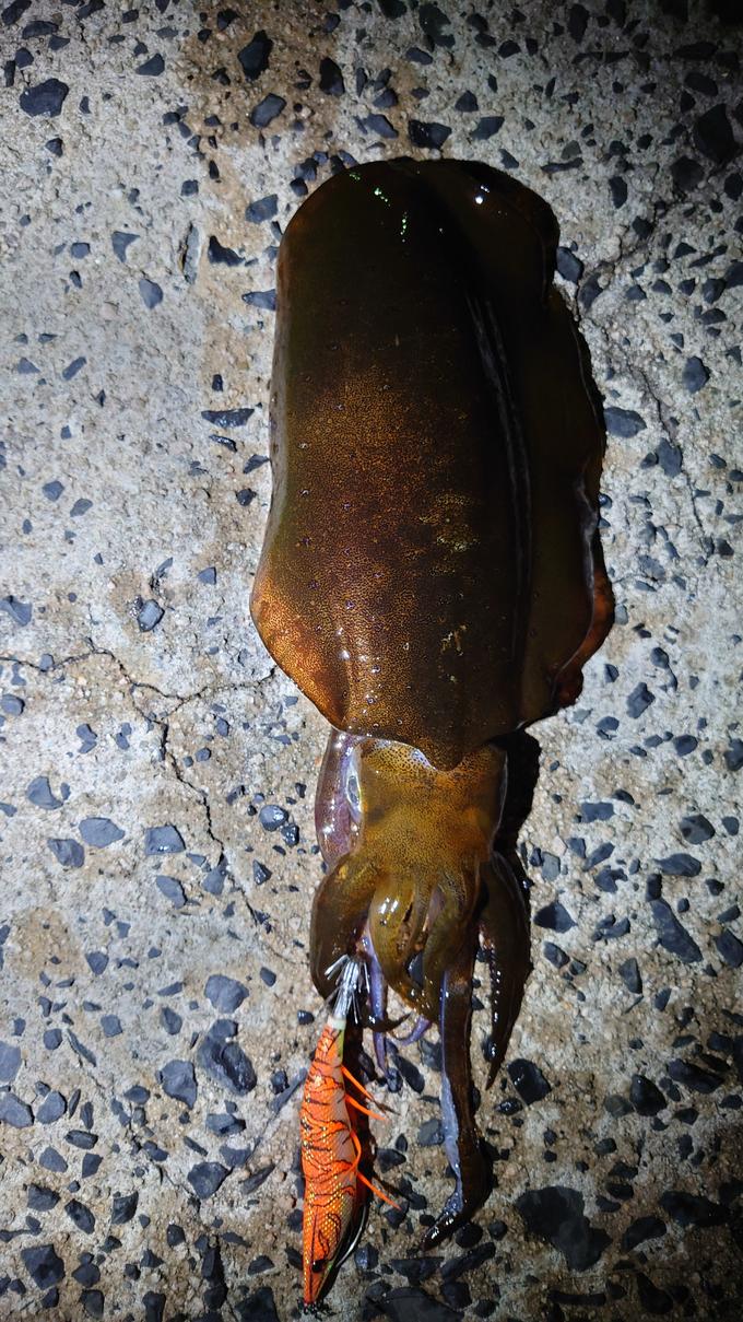 月夜の大潮で、潮が動かなった中、一瞬潮が動いたら抱いてくれました。夏イカをゲットしました。