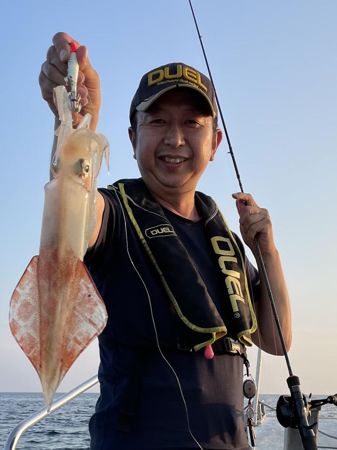 今週は将和船長に誘って貰い玄界灘へイカメタルでのヤリイカ狙いの釣行。前回もお会いした辻さんや釣友杉原さんと船首側でロッドを振る。まだ暗くなる前からボトム(底)付近で良型を釣り、その後もポツリポツリながらイカの居場所を探りながら拾い釣り。水深40m前後のポイントで、パラシュートアンカーで流しながらの釣りで、イカ独特のティップが跳ね上がるようなアタリなど様々なアタリを楽しみました。