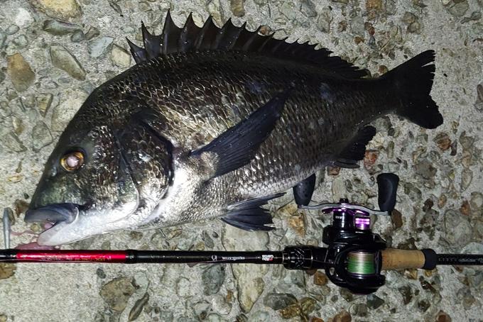 夏と言えばチヌゲームと言う事でフリーリグでチヌを狙ってきました。 大潮の下げ潮で最もチヌを狙いやすい条件。アップ気味で投げリフト&フォールでヒット。 合わせると一気に走り出し「ほんとにチヌか?」と言うような強烈な引き。途中根や岸壁際に潜り込もうとしラインが擦れる感じがするも根ズレに強いハードコア スーパーX4とパワーリーダーを信じ慎重にファイトし無事54cmの超大型チヌをゲットすることが出来ました。