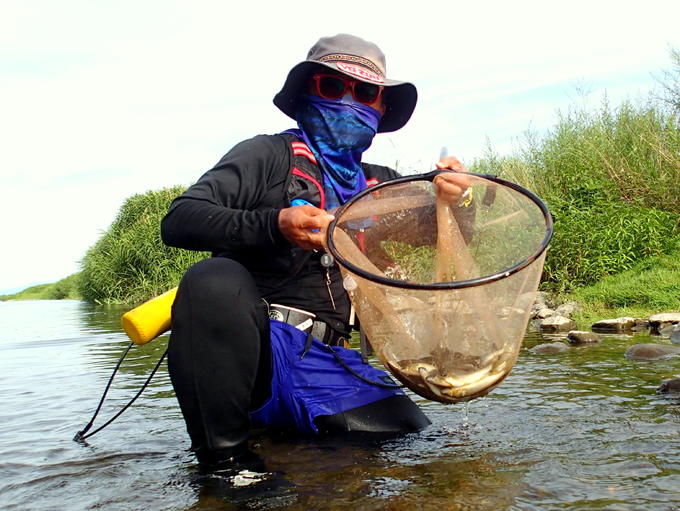 夕方3時、群れ鮎が出喰みを始めるタイミングで釣り開始。アーマードFH鮎水中糸0.06号の操作性の良さを利用して引き釣りと泳がせ釣りを使い分け、アタリが途切れぬよう心がけました。2時間入れ掛かりを楽しむことが出来ました。