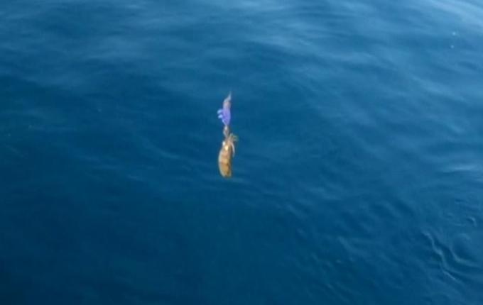 海面の浮遊物の下には、アオリイカの新子がたくさん居ます。