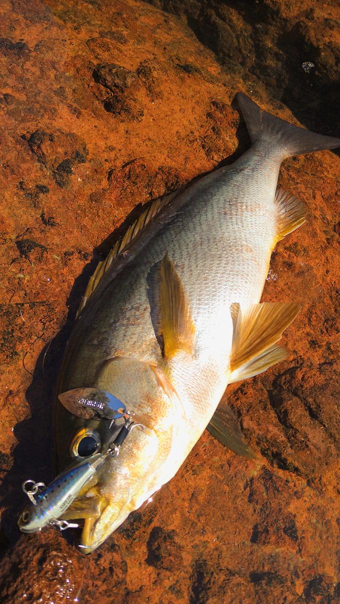 サラシにソリッドスピン32gで量型イサギ! このあとも連発するもウネリが大きく なかなか取り込みが困難で沢山バラしましたが、 タナをきっちり合わせないと喰ってこないテクニカルな 釣りで友人と楽しめました!