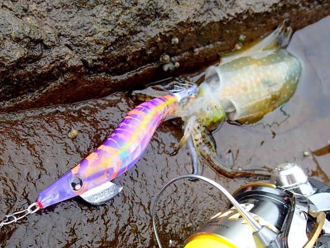 ポイントは超クリアーな澄み潮。こんな場面ではスケルトンボディーが効果的と考え、LQ(レンズエギ 透明布巻)3.5 GKMMを結べば連発でヒット。ナチュラルな輝きとゴーストボディで数釣りが出来ました。
