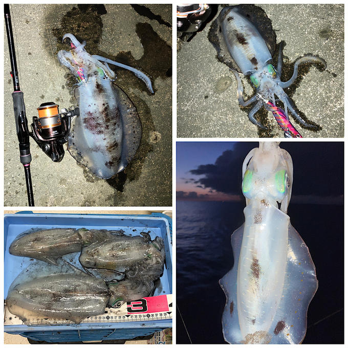 夕まずめ、潮止まりから潮が動き出したその時にパタパタと釣れました。いずれもアオリーQ LCのモンスターマスター3号でした。胴長26cm、20cm、19.5cmという事で大満足の釣行となりました。