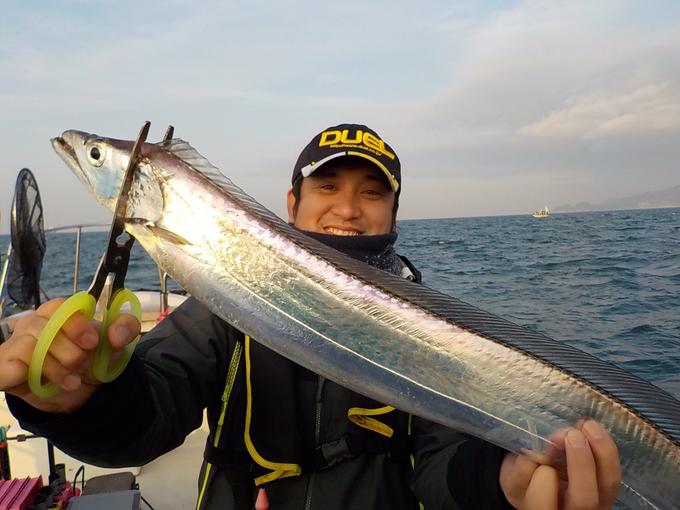 またまたいつものだんだん丸で海へ行ってきましたので状況報告します!今回の太刀魚釣行はF4クラスの数釣りが楽しめるとの情報でロングラン。しかし、ポイントに到着すると底引き網漁師の船団で遊漁船はお手上げ状態…。30m前後の浅いエリアで漁師さんを避けながらジグを落としてみるとポツポツと当たるものの、F3までの小型。仕切り直しでまたまたロングラン(汗)松山沖まで戻り最後の時合いでダブル、トリプル連発のナイスサイズラッシュ!今回の松山沖ではサイズ狙いに絞り、タチ魚リアルヘッドで勝負!狙い通りにドラゴンサイズを仕留める事が出来ました。今回の水深は70m前後でテンヤは50号、エサはウルメイワシを使用しました。やはり今回もサイズはテンヤの方が良かったようです!瀬戸内の太刀魚は今後も1月下旬くらいまではサイズ狙い、数釣りともに十分楽しめるようです。