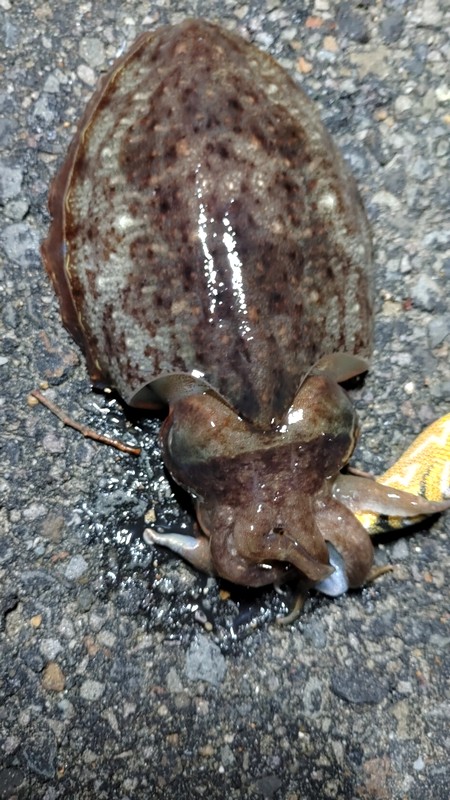 エギをキャスト後、フォール中に着底しないので?って思ったら、フォール中に抱いてました(笑) しかも今回もアオリじゃなくコウイカ・・・まあいいですけどねぇ。