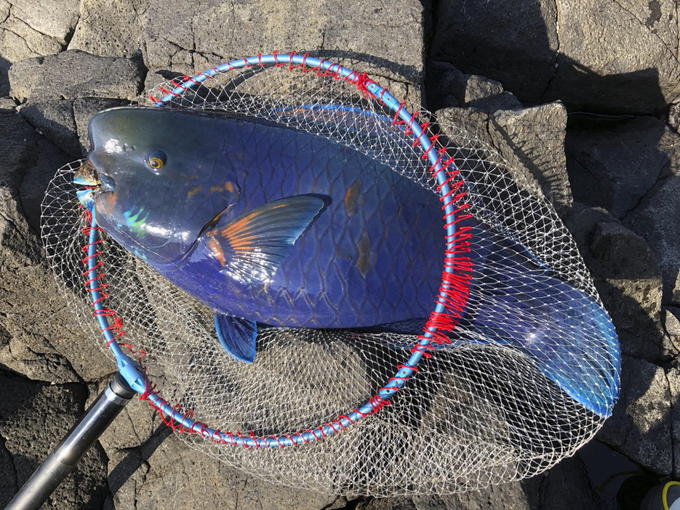 静岡県南伊豆入間へ行ってきました。この時期の狙いは乗っ込みのメジナ。メジナは38センチまでがポツポツでしたが、どうしようもない強烈なアタリが何度も襲ってきました。10分ほど格闘してようやく釣り上げてみると5キロはありそうな青ブダイでした。釣果としては残念でしたが6LBのクイックショットCNに1.75号のハリスというメジナ狙いのタックルだけに、ラインの強さを実感できました。その後も数匹釣り上げ、後に聞いたところ今シーズンは特に多いそうで、どちらかというと南方系の魚だけに改めて温暖化の影響を感じることとなりました。