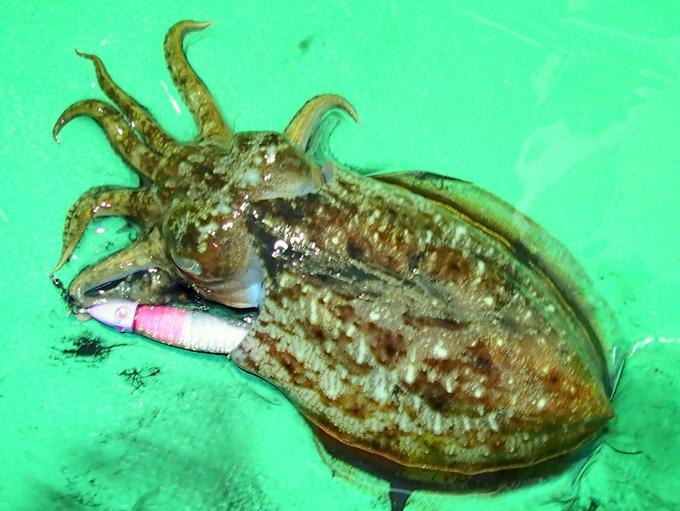 水深80mラインのヤリイカメタル。ボトムギリギリをロングジャーク&フリーフォールの丁寧な誘いで攻めていると、小さなアタリで珍客のモンゴウイカがヒットしてきました。四ツ目のスライドアクションに思わず横抱きしてしまったようで、四ツ目はボディーに吸い込まれていました。