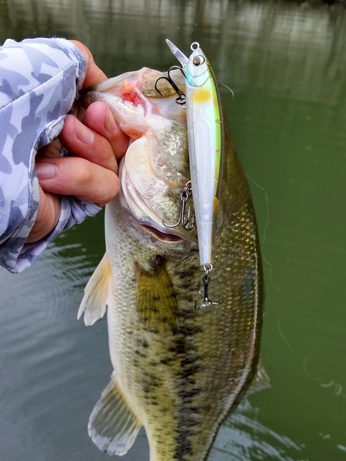 今回は大荒れ予報の津久井湖へ出撃! 雨風が強いとなればやっぱり巻物でしょ!って事でショアラインのバンクは『L-バス クランク MR』、岩盤は『L-バス ジャークベイト』で狙い37㎝と39㎝をキャッチ! 天候とは裏腹にバスの活性はあまり高くなかった様で、特にジャークベイトは移動距離を抑えた弱めのジャークをしている時に喰ってきましたよ。 また、今日は『ライズハンズクロー3.5』のリーダレスダウンショットで45㎝を頭に3本をキャッチ! 水に濁りが入っていたので、カラーはちょっと強めなAザリガニが効きましたね。