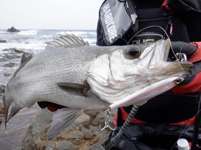 この日の気象予報は西風波高2mのち1.5m。磯のヒラスズキ狙いで釣行しました。風を正面から受ける西向きエリアへエントリーするも、この前日は南西風だったので波は想定よりも弱目。ゴロタのシャロー一帯、セット波を待ってのアプローチは、フルキャストでブレイクラインに広がるサラシを狙い撃ち! チョイスしたルアーはヘビーショット105。着水からリール約2巻の沖合でアタリを捉えました!メインラインTX8の高感度を実感した釣行でした。