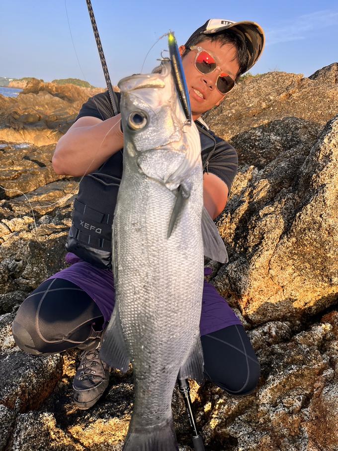 波間に漂わせたシャローランナー120Fに表層炸裂するくらいのド派手なバイト!3フックなのでガッチリ掛かってました