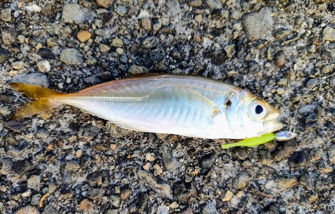 10cm程の豆アジが入っていました。0.5gのジグヘッドで複数匹が釣れました。