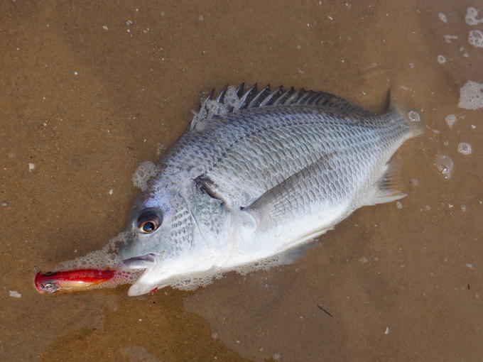 博多湾サーフへトップゲームに行って来ました。実はこの日、朝一は福岡近郊の磯エリアへトップチヌ狙いで釣行しました。磯ではスピットポップ70Fに良型チヌがヒットしましたが、惜しくもバラしてしまいました。磯エリアでは周辺にアングラーが3人も。混雑した状況だったので、サーフエリアへ移動することに。8時前の日照りが強くなり始めた時間でしたが、写真のキビレとシーバスがスピットポップ70Fにヒット!サーフでは1時間弱で暑さに耐えられなくなり9時過ぎにゲーム終了。短時間ゲームでしたが、サーフではベイトっ気も多くて楽しめましたよ!釣れてくれてありがとう!