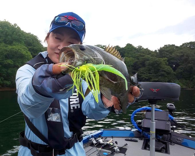 桧原湖釣行。雨上がりのローライトのタイミングに、ウィードエリアで巻いてキャッチ!